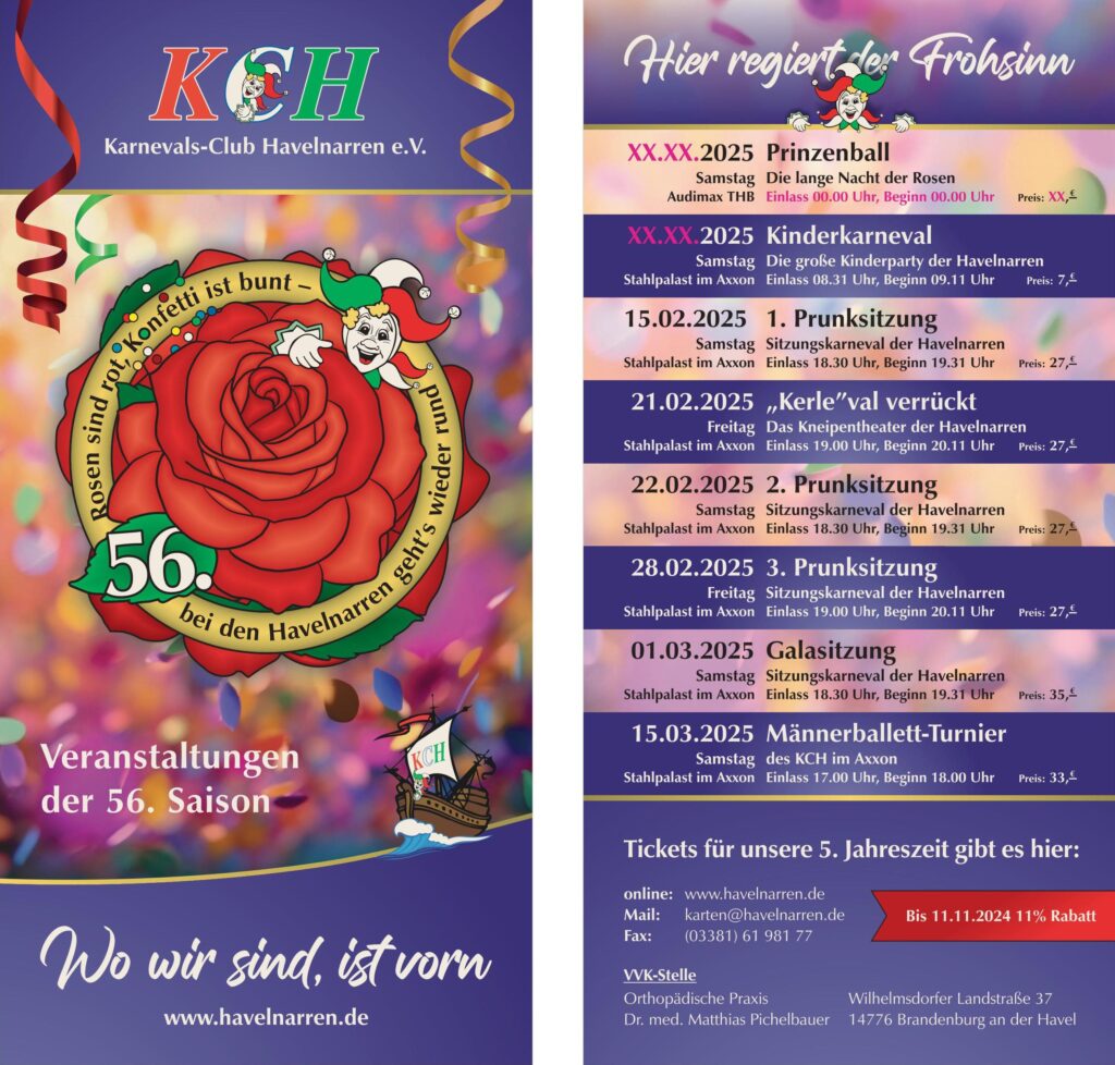 Auch in der 56. Saison bin ich beim Karneval des KCH in Brandenburg an der Havel mit einer bunten musikalischen Unterhaltung als DJ dabei. Immer Freitag und Samstag können Sie mich in Anschluss an den Sitzungen live vor der Tanzfläche mit meinen DJ Musik-Mix erleben. Beginn ist der 11.11.2024 mit dem Karnevalsumzug durch die Innenstadt feiern die Narren traditionell den Beginn der fünften Jahreszeit. Mit Narrenschiff, Prinzenkutsche und jeder Menge bunter Wagen ziehen alle Aktiven unterstützt von zahlreichen Brandenburger Gruppen durch die Straßen. Am Ende des Zuges findet die große Prinzenproklamation statt. Pünktlich um 11.11 Uhr beginnt dann die närrische Zeit. Zuvor holen sich die Havelnarren jedoch stets die Stadtschlüssel aus dem Brandenburger Rathaus, denn von nun an regieren die Narren die Stadt. Alle Brandenburger und Gäste von Nah und Fern sind eingeladen mit uns im BonBon-Regen den Straßenkarneval zu feiern!